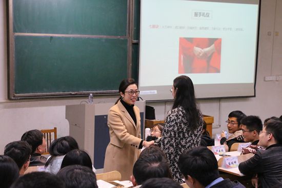 课堂上,戴洁从“礼仪概况”、“仪态仪表”、“言谈礼仪”、“社交礼仪”四个方面对这门课进行了介绍。礼仪是有原则的,她讲到在不同场合下有四条原则:尊重原则、适度原则、谦和原则、真诚原则,应本着四条原则去待人接物,其中重点讲解了着装规范和神态仪表。为了让同学们加深礼仪规范的理解,她形象的联系到研究生的日常学习和生活,比如蹲姿比喻成捡钱的动作等,并通过亲身展示以及参与者的积极配合,让同学们对不同场合下的站姿、坐姿、走姿、蹲姿、手势等行为规范有了全新的认识。