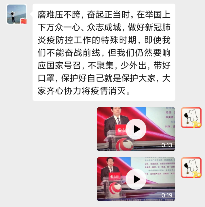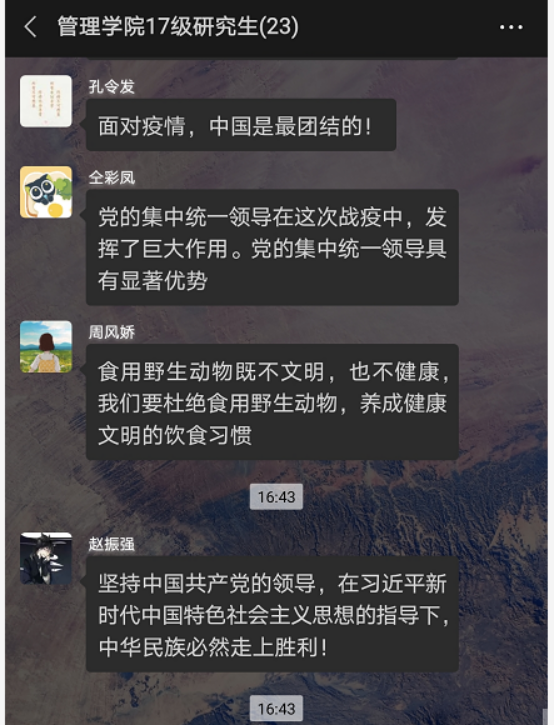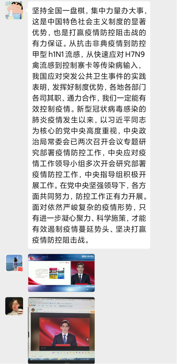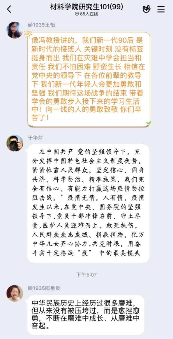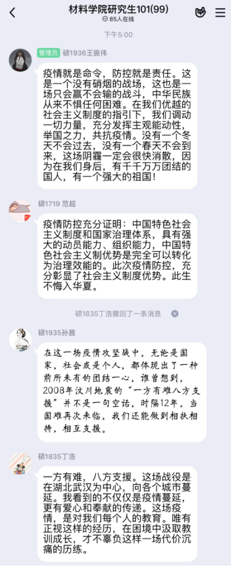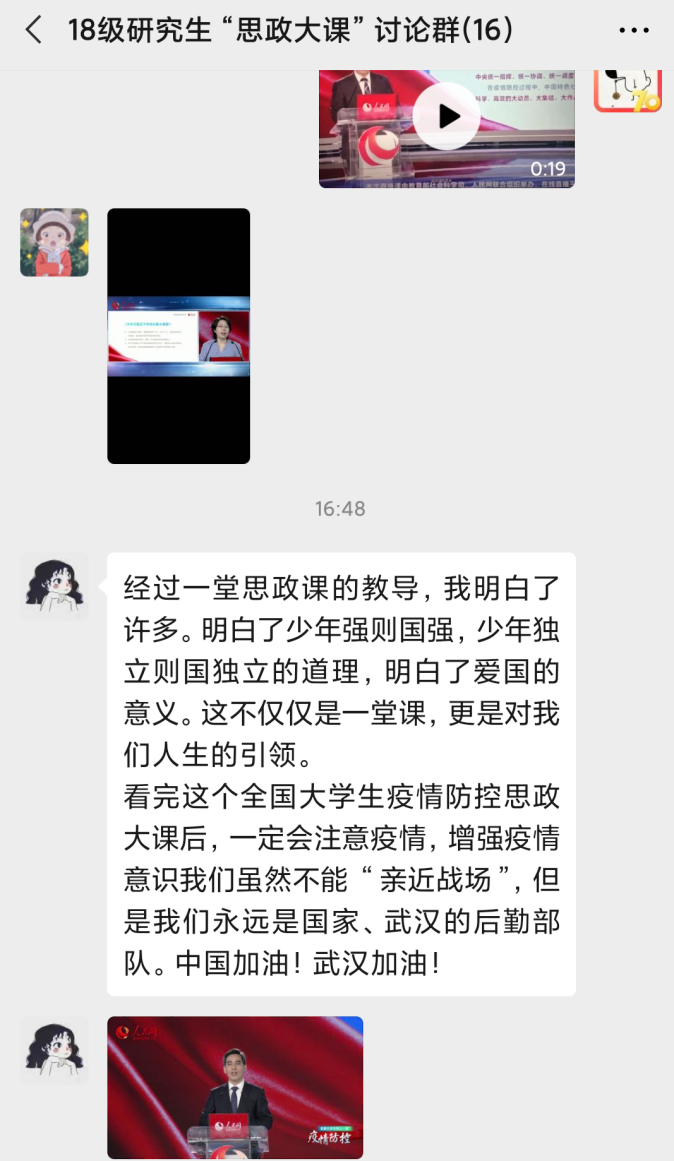 在观看直播过程中,各研究生培养单位通过班级群、党支部群等线上平台开展深入交流,随时就“思政大课”的内容开展热烈的线上讨论,引导研究生更好的理解党中央关于疫情防控的决策部署,增强“四个意识”、坚定“四个自信”、做到“两个维护”,传承和弘扬爱国主义精神,坚定打赢疫情防控阻击战的信心和决心。