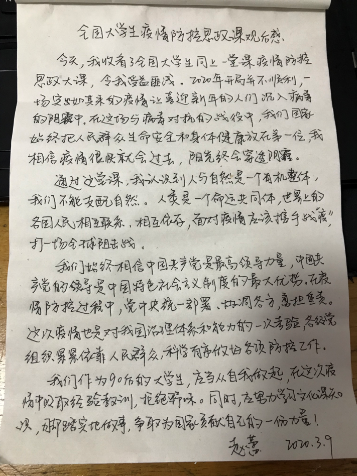 课程结束后,各研究生培养单位纷纷组织研究生围绕本次“思政大课”分享自己的心得体会,让思政教育从“云上”落在“笔尖”走进“心里”。各培养单位的研究生纷纷畅谈自己对战“疫”的思考与感悟、对思政课的理解与认识。