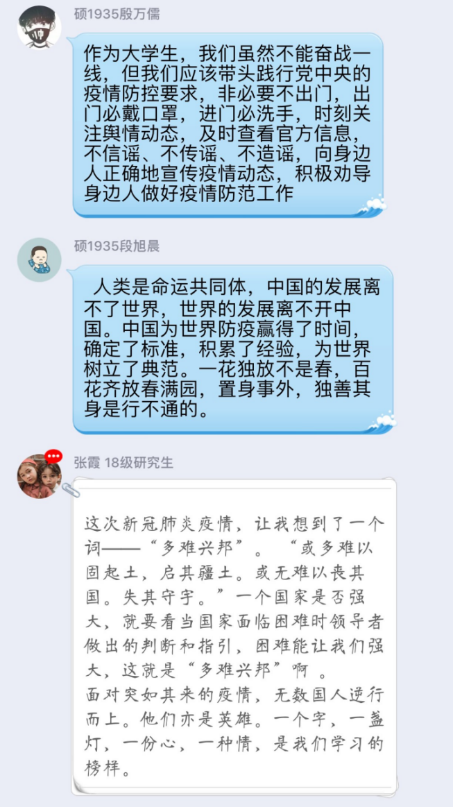 化学化工学院研究生张栓表示,在这次疫情防控战中,深深感受到了全国人民对党和政府的信任以及我们国家的实力,再次体验到了只有中国共产党才能领导中国应对任何灾难。同时我也希望全国人民一定要严格听党指挥,早日打赢这场防疫战争。