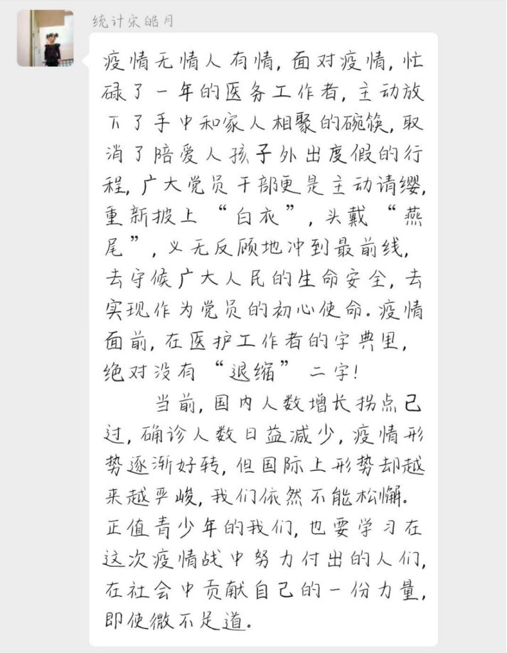 文学与新闻传播学院研究生徐姗姗认为,在这场疫情阻击战中,验证了中国共产党是中国特色社会主义的最大优势,是我们坚强的保障。国家领导集体立足国情,分析情势,紧密安排,下层党委、政府贯彻实施,基层党组织雷厉风行,这些政府作为转化为我国的治理效能,是治理体系和治理能力的实践。
