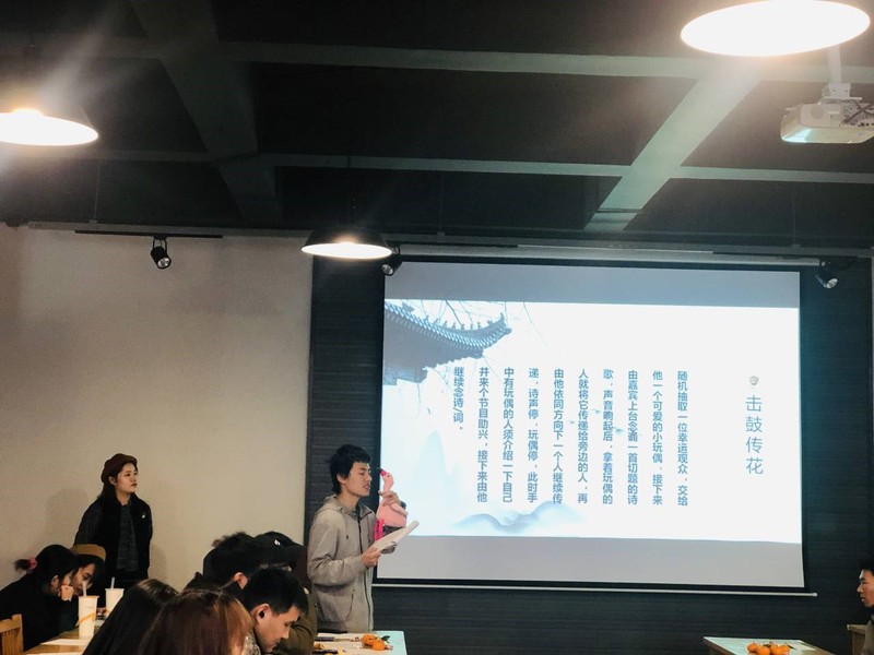 随后,活动被“诗词抓阄--我是大锦鲤!”环节推向高潮,本环节主要分为两轮,第一轮则是箱中存放诗句,每人随机从箱子中抽取自己的诗句。若能与其他人手上的诗句匹配成功,则获赠明信片一枚,互赠寄语,并交换明信片。紧接着,匹配成功者再次进入第二轮,再从箱子中抽取诗句,若匹配成功者,可以获得小礼物一个。最后,活动在欢快的背景音乐以及主持人的话语下圆满落幕。