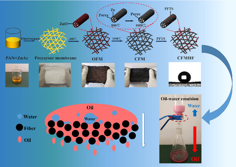 科研人员采用简便、有效的方法,通过静电纺丝、热处理以及氟化工艺,制备出柔性的、超疏水碳纤维膜(CFMHF),制备流程如图1所示。在电纺溶液中引入了醋酸锌(ZnAc),热处理过程中在碳纤维内部形成孔隙,显著提升了碳纤维的柔韧性,并对其成孔机理进行了探讨。测试结果表明,CFMHFs具有较高的比表面积和良好的超疏水性(水接触角,WCA=155.9°), 并且其油通量高(3590 L·m-2·h-1)、油水分离性能优异。仅在重力驱动下,CFMHFs对非乳化和乳化油水混合物的分离效率均在98%以上。更重要的是,所制备的CFMHFs在高温、低温、强酸、强碱、高盐、有机溶剂等恶劣条件下均表现出良好的稳定性。该策略对设计高性能油水分离膜具有指导意义。