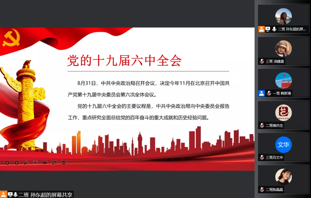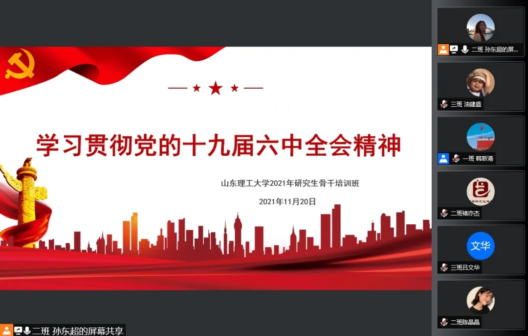 为认真学习贯彻党的十九届六中全会精神,切实把党的百年奋斗重大成就和历史经验转化为奋进新征程的强大动力,11月20日,山东理工大学2021年研究生骨干培训班召开线上专题学习交流会,集中学习领会党的十九届六中全会精神。研究生骨干培训班全体成员参加会议。